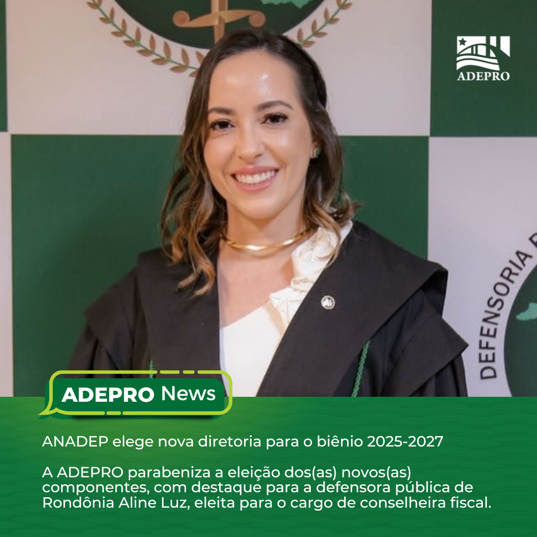 A ADEPRO parabeniza a nova gestão e destaca, com grande orgulho, a eleição da defensora pública de Rondônia, Aline Luz, para o cargo de conselheira fiscal da ANADEP. Aline representará Rondônia com competência e dedicação, contribuindo para o fortalecimento da Defensoria Pública em âmbito nacional.