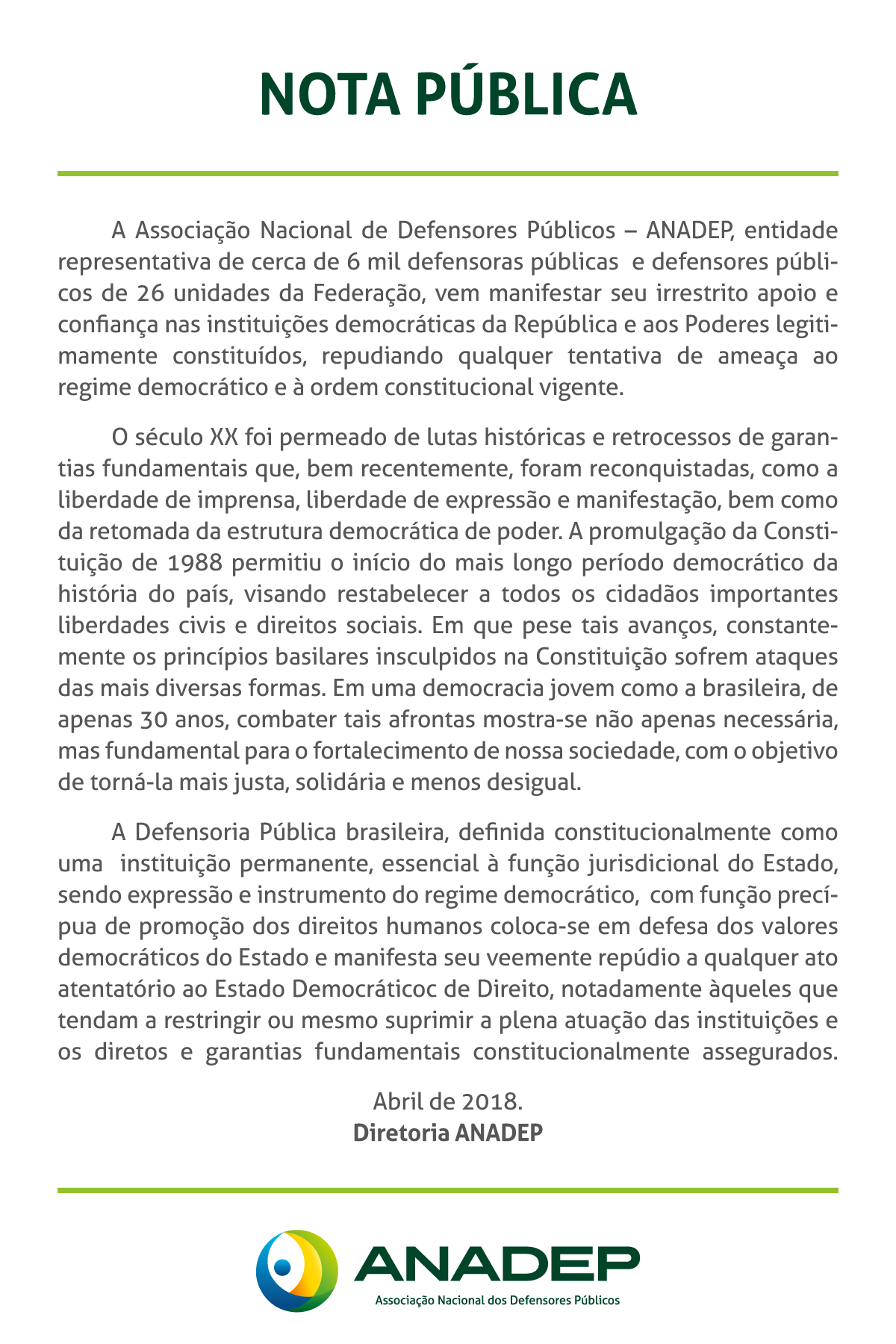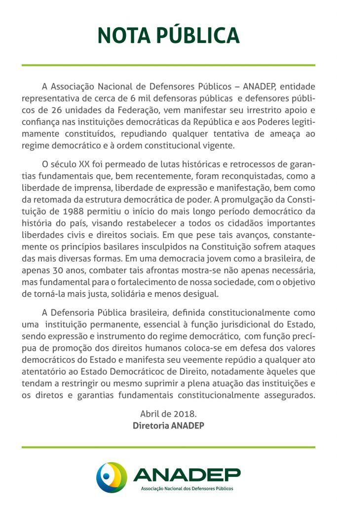 Confira o nota pública da Anadep na íntegra: