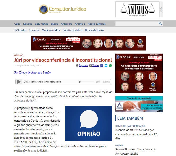 Artigo: “Júri por videoconferência é inconstitucional”, por Diego de Azevedo Simão