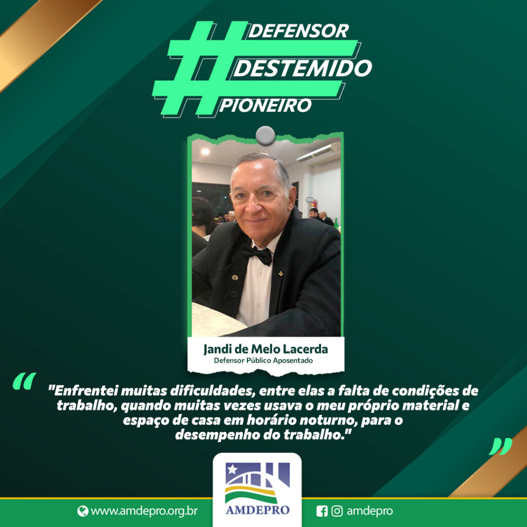 A Associação dos Membros da Defensoria Pública do Estado de Rondônia (Amdepro) divulga a quinta matéria do Projeto Defensoras e Defensores Destemidos Pioneiros para contar a trajetória das associadas e associados pioneiros do estado, buscando valorizar a luta de quem criou as bases de nossa atuação associativa e institucional. O destaque desta edição é o Defensor Público aposentado Jandi de Melo Lacerda, que, mesmo enfrentando desafios, muitas vezes utilizando os próprios recursos, viajou aos quatro cantos do Estado para garantir assistência jurídica gratuita aos mais necessitados e representar a Defensoria Pública, feito realizado em diversos eventos, inclusive fora de Rondônia.