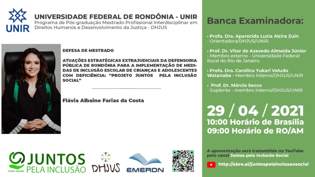 A Defensora Pública Flavia Albaine apresenta, nesta quinta-feira (29), defesa da dissertação de mestrado com o tema “Atuações estratégicas extrajudiciais da Defensoria Pública de Rondônia para implementação de medidas de inclusão escolar de crianças e adolescentes com deficiência: ‘Projeto Juntos pela Inclusão Social”. O mestrado é parte do Programa de Pós-graduação Mestrado Profissional Interdisciplinar em Direitos Humanos e Desenvolvimento da Justiça da Universidade Federal de Rondônia (Unir).