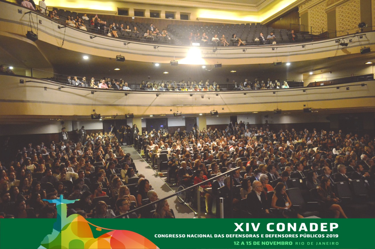Mais de 900 pessoas lotaram o auditório principal do histórico Teatro Riachuelo, no centro do Rio de Janeiro, para acompanhar a cerimônia de abertura do XIV Congresso Nacional das Defensoras e Defensores Públicos (Conadep), que acontece até a próxima sexta-feira (15). O evento tem por objetivo debater o fortalecimento da Instituição e os desafios dos próximos anos, a fim de ampliar o acesso à Justiça e a efetivação da autonomia da Defensoria Pública.
