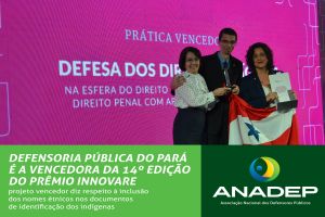 A prática “Defesa dos direitos indígenas”, dos defensores públicos do Pará Juliana Oliveira e Johny Giffoni, foi a vencedora da 14ª Edição do Prêmio Innovare na categoria Defensoria Pública, o projeto tem o objetivo de incluir nomes étnicos nos documentos de identificação dos indígenas. A cerimônia aconteceu na terça-feira (5) no Salão Branco do Supremo Tribunal Federal (STF), em Brasília.
