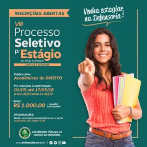 A Defensoria Pública está oferecendo mais uma oportunidade aos acadêmicos de Direito do Estado de Rondônia. Estão abertas as inscrições para o 8° Processo Seletivo de Estagiários da instituição (DPE-RO), que segue até o próximo dia 17 de maio. Quem deseja participar do certame deve realizar a pré-inscrição por meio do formulário disponível neste link.