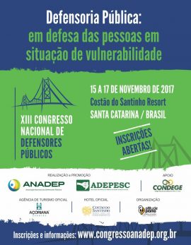A associação Nacional dos Defensores Públicos (Anadep) e a Associação dos Defensores Públicos do Estado de Santa Catarina (Adepesc) promoverão o XIII Congresso Nacional de Defensores Públicos. Sob o tema “Defensoria Pública: em defesa das pessoas em situação de vulnerabilidade”, o evento será realizado de 15 a 17 de novembro, no Costão do Santinho, em Florianópolis. As inscrições poderão ser feitas até o mês de julho.