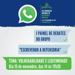 Defensores públicos que compõem o grupo de whatsapp ‘Escrevendo a Defensoria’ irão se reunir pela primeira vez durante encontro no ‘XIII Congresso Nacional de Defensores Públicos’, que será promovido em Florianópolis, de 15 a 17 de novembro. A ideia é fomentar o intercâmbio entre os membros do grupo e contribuir para o fortalecimento e o aprimoramento da atuação da Defensoria Pública.