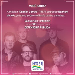 A Associação dos Membros da Defensoria Pública de Rondônia (Amdepro) apoia a causa dos ‘16 Dias de Ativismo pelo Fim da Violência contra as Mulheres’. Durante o período, a entidade publicará materiais de sua campanha “Não silencie, denuncie!”, que será divulgada pelo site oficial e redes sociais (Facebook e Instagram), incluindo peças publicitárias com a letra da música ‘Camila Camila’, da banda Nenhum de Nós, que fala sobre violência praticada contra uma menina de apenas 17 anos de nome que dá título à canção, sucesso do rock nacional nos anos 1980.