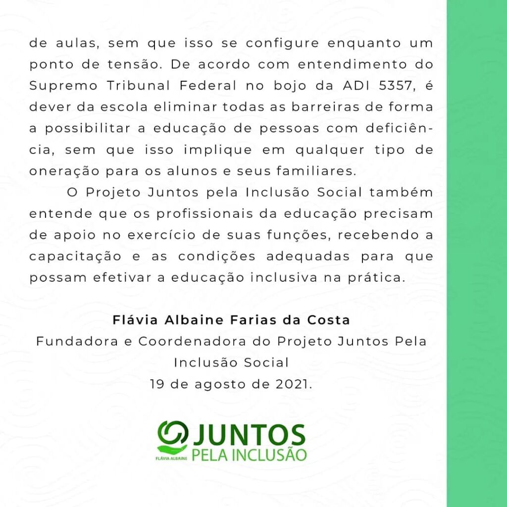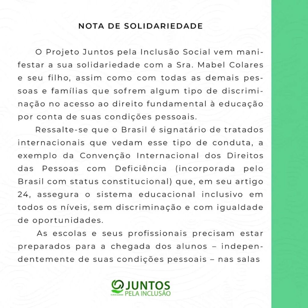 O site Folha Nobre publicou uma nota de solidariedade do projeto ‘Juntos pela Inclusão Social’, idealizado pela defensora pública da Comarca de Colorado do Oeste Flávia Albaine. A manifestação de apoio foi elaborada tendo em vista o caso da mãe Mabel Colares e seu filho, a criança autista de nove anos, impedida de frequentar uma escola de Porto Velho.
