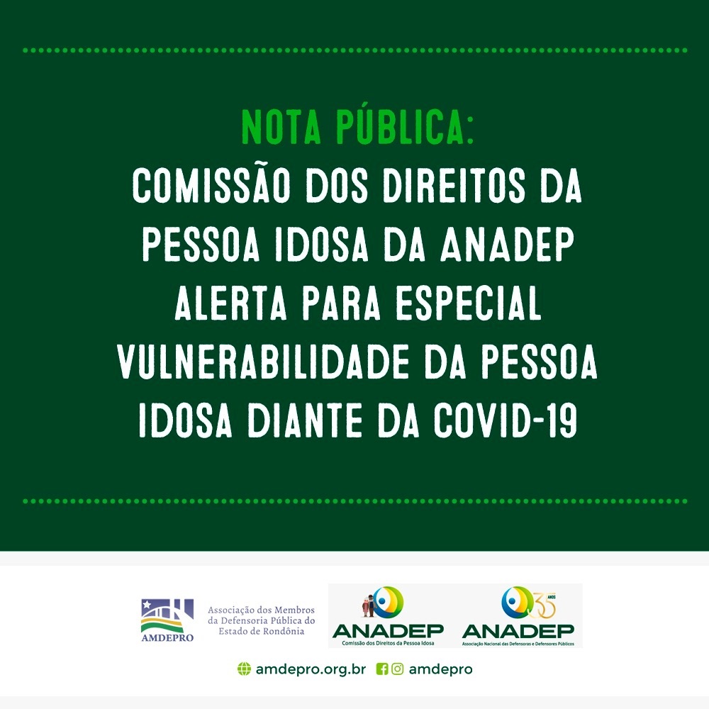 A Comissão dos Direitos da Pessoa Idosa da Associação Nacional das Defensoras e Defensores Públicos (Anadep) divulgou, nesta quarta-feira (20), nota pública para alertar para a especial vulnerabilidade da pessoa idosa diante da Covid-19.