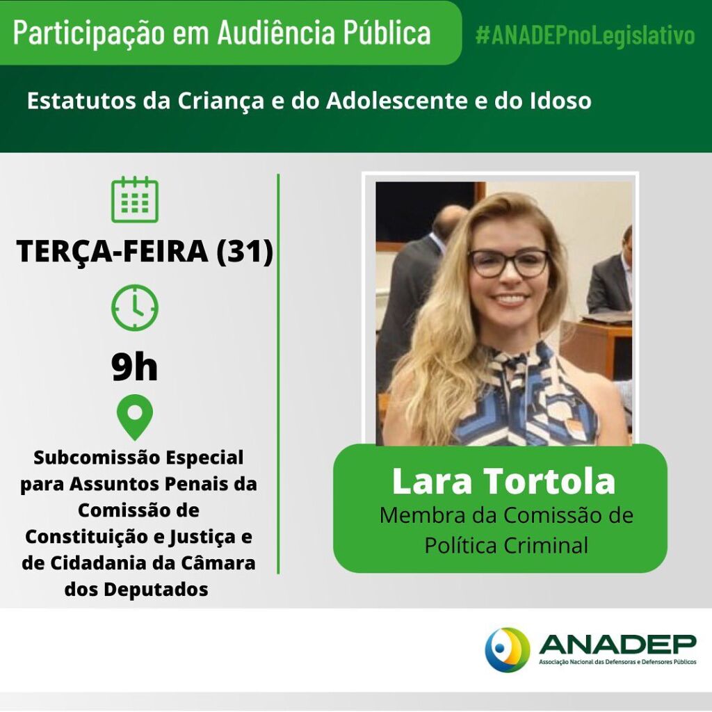 A secretária-geral da Associação dos Membros da Defensoria Pública de Rondônia (Amdepro), Lara Tortola, que também é membra da Comissão de Política Criminal da Associação Nacional das Defensoras e Defensores Públicos (Anadep), participará nessa terça-feira (31) de uma audiência pública na Câmara dos Deputados, no âmbito da Subcomissão Especial de Assuntos Penais da Comissão de Constituição e Justiça e Cidadania (CCJC). O encontro debaterá os estatutos da Criança e do Adolescente e do Idoso.